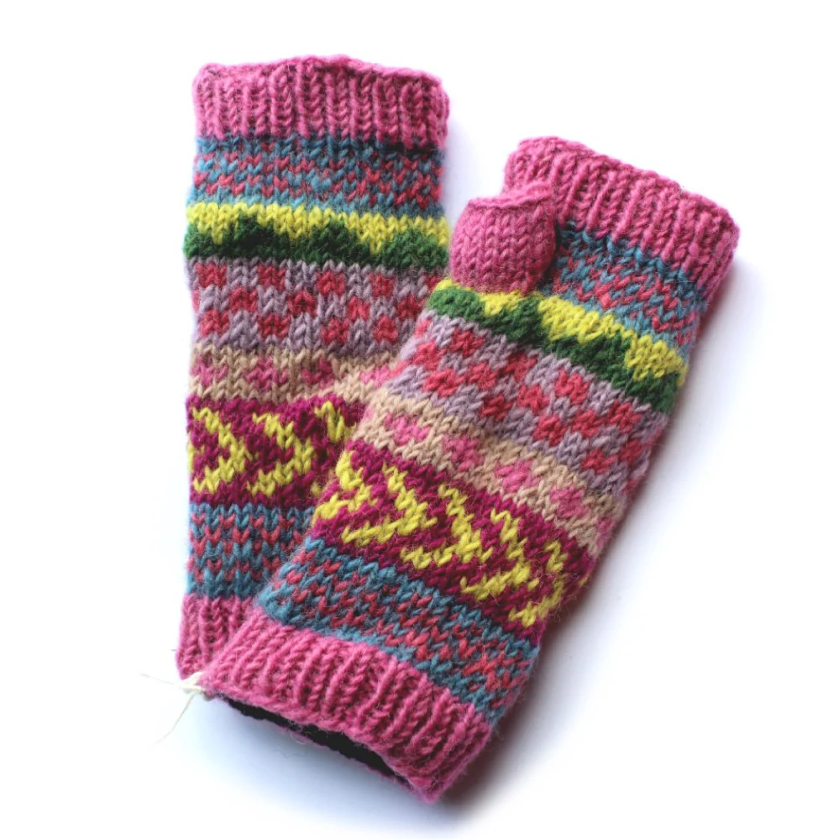Cozy wool wrist warmers in a colourful winter stripe design. Perfect for keeping your fingers free and your wrists and harms warm.