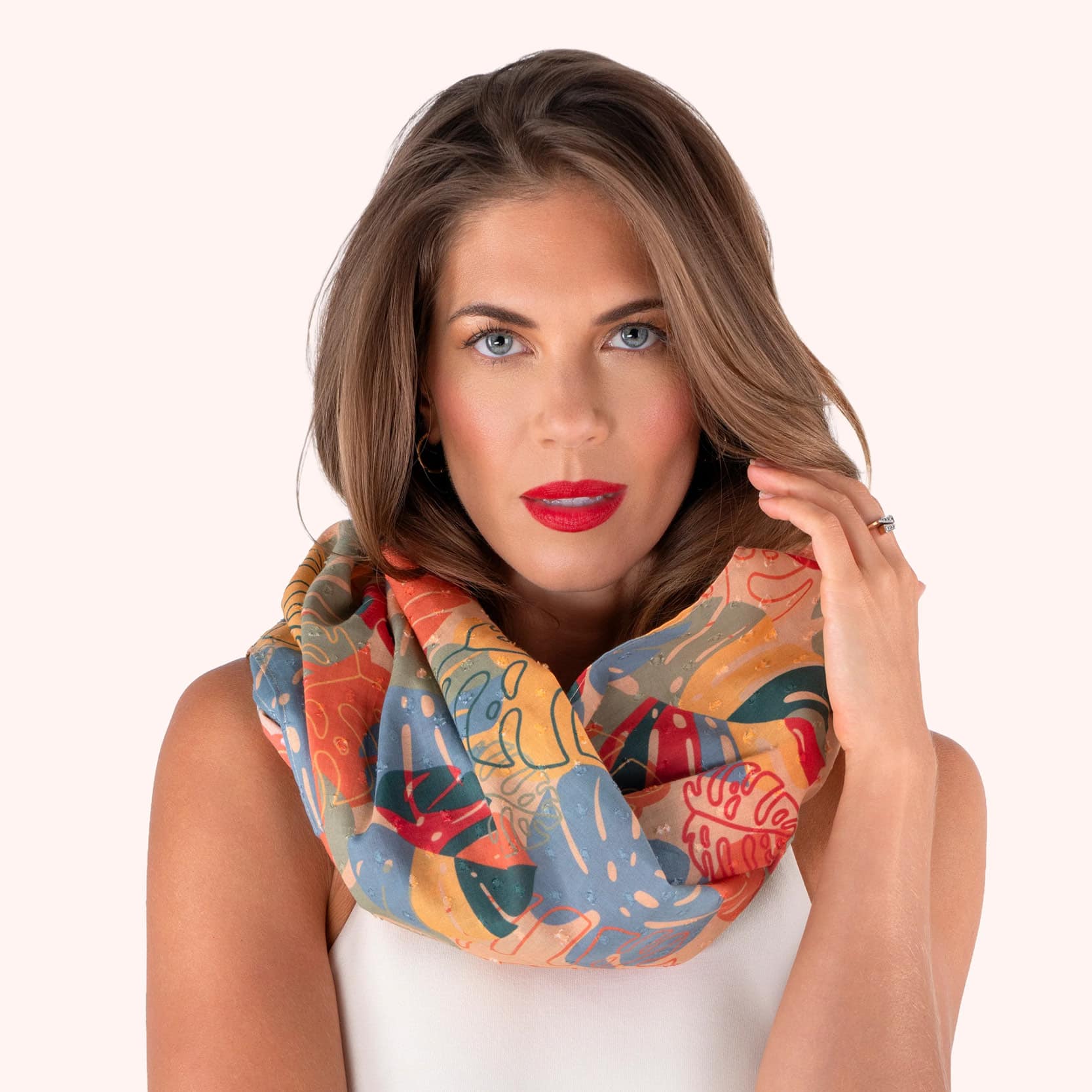 Our Exotic Leaves infinity scarf features striking leaves with intertwining vibrant tones. Sunny and partially shaded, this rainforest inspired print is perfect for all art and travel lovers! Equally suited to wrap around on the way to the shops or to elevate your night look, you will never want to take it off. Go on, treat yourself!
