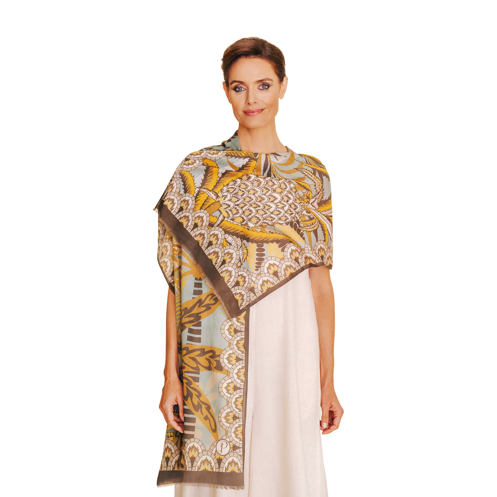 Did someone say summer feeling? Dive into a world of patterned palms and feel surrounded by summertime! Not just a look, a vibe! With art deco inspirations, this cotton scarf is perfect for pairing with jeans and a top to elevate your everyday.